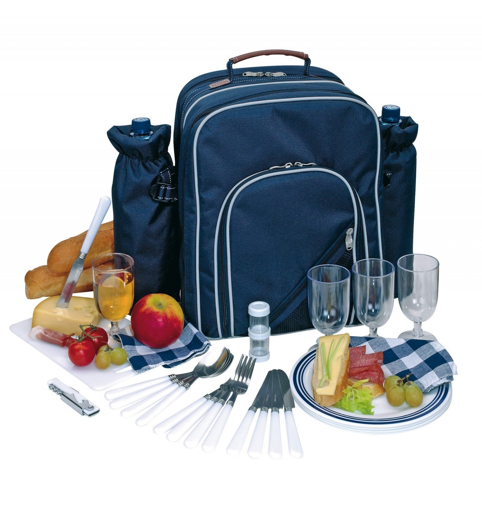 De picknicktas Hydepark is de ideale picknicktas voor een gezellig dagje uit met familie of vrienden. De picknicktas is voorzien van 4 borden, 4 lepels, 4 messen, 4 vorken, 4 bekers, vier servetten, een snijplankje, een kelnersmes, een broodmes en een peper & zout setje. Het bestek is van RVS zodat U geen last heeft van brekend bestek. Er zit een handige snijplank bij om bijvoorbeeld brood of kaas op te snijden wat lekker is bij een glaasje wijn. Ook zitten er 4 kunststoffen servetten bij met een blauw wit geruit patroon. De borden zijn van plastic met dunne blauw randjes als afwerking. Alle spullen in de tas kunt U vast maken met zwarte elastieken bandjes. De tas heeft 3 vakken waarvan 2 ruime vakken met daarin het servies. In het andere vak kunt U zelf uw eigen spullen erin doen. Dit vak is tevens het koelvak. Aan de voorkant van de tas zit een kleiner vak waar een klein nettenvakje opzit. Genoeg ruimte dus. De twee koelvakken aan de zijkant kunt U los maken indien nodig. De tas heeft en blauwe kleur met witte afweking. Aan de bovenkant zit een handvat waarmee U de tas gemakkelijk op kan tillen. Aan de achterkant zitten de draagbanden waarmee U het als rugzak mee kan nemen. De draagbanden kunt U verstellen en ze zijn zeer comfortabel. Ook na langer gebruik. De tas heeft een afmeting va 28x21x39 centimeter. Het is een perfect formaat voor comfort gebruik. Kortom, de perfecte picknicktas!
