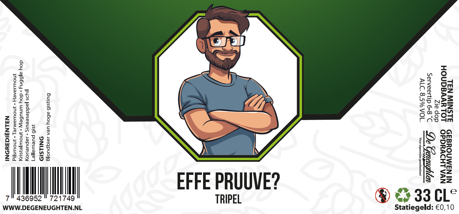 Een krachtige en karaktervolle tripel, gebrouwen voor momenten waarop je nét wat meer wilt genieten. Effe Pruuve? Tripel schenkt uit met een mooie goudkleurige schuimkraag en sprankelt uitnodigend in het glas — ideaal voor een goed gesprek of een gezellige borrel.